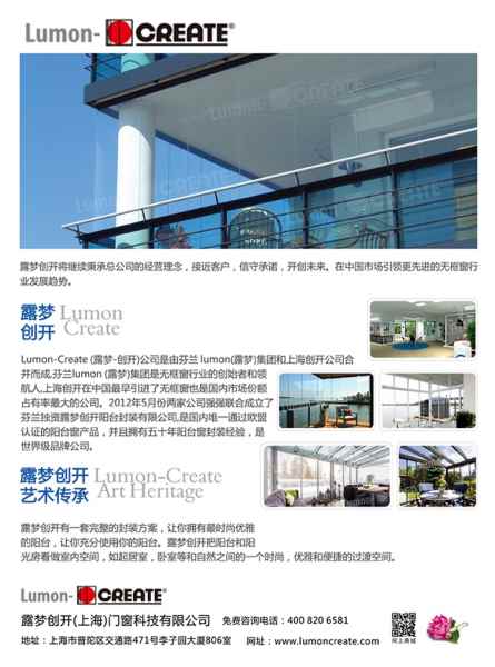 | 露夢創(chuàng)開(上海)門窗科技有限公司是由芬蘭lumon(露夢)公司和上海創(chuàng)開無框陽臺窗有限公司通過戰(zhàn)略合作,于2013年成立的新公司,并成為創(chuàng)開Create品牌的唯一授權(quán)使用者。芬蘭lumon(露夢)公司是無框窗產(chǎn)品和行業(yè)的創(chuàng)始者和領(lǐng)航人,上海創(chuàng)開則是中國市場上最早引進無框窗也是國內(nèi)市場份額占有率最大的公司。2012年5月兩家公司強強聯(lián)合成立了蘇州露夢創(chuàng)開陽臺封裝有限公司(生產(chǎn)制造公司),于2013年在上海成立露夢創(chuàng)開(上海)門窗科技有限公司(銷售公司),開始引進并推廣國內(nèi)唯一通過歐盟認證的陽臺窗產(chǎn)品,以更完善的產(chǎn)品,以四十四年陽臺窗封裝經(jīng)驗,為中國客戶帶來更好的陽臺產(chǎn)品體驗。 | ||||||||||||||||||||