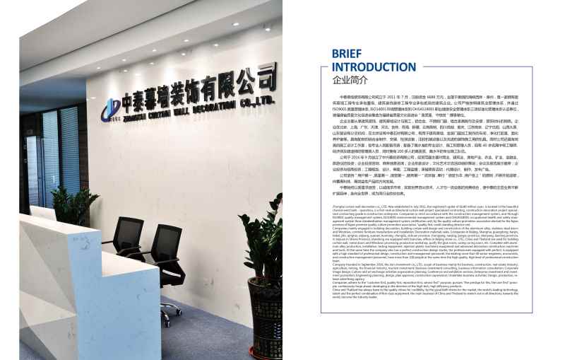 | 中泰幕墻裝飾有限公司成立于2011年7月,注冊資金6688萬元,坐落于美麗的海峽西岸·泉州,是一家擁有建筑幕墻工程專業承包壹級、建筑裝飾裝修工程專業承包貳級的建筑企業。公司嚴格按照建筑業管理體系,并通過ISO9001質量管理體系、ISO14001環境管理體系和OHSAS18001職業健康安全管理體系三項標準化管理體系認證單位,被福建省質量文化促進會推選為福建省質量文化促進會“重質量、守信譽”理事單位。 企業主要從事建筑裝飾、建筑幕墻設計與施工,鋁合金、不銹鋼門窗、組合家具制作及安裝;裝飾材料的銷售,企業在北京、上海、廣東、天津、河北、吉林、青海、新疆、云南昆明、四川成都、重慶、江蘇南京、遼寧沈陽、山西太原、山東皆設有分支機構,在北京設有中泰石材有限公司,有用于建筑幕墻、金屬門窗加工制作的車間,凈化打膠室、固化養護室等。具有配套的鋁合金制作、安裝、檢測設備,注膠機械設備以及先進的裝飾施工用的機具。同時公司還具有完善的施工設計工作室,各專業人員配備完善,配備了高水準的專業設計、施工和管理人員,現有40余名高中級工程師、經濟師及建造師的管理層人員,同時擁有200多人的高素質、高水平的專業施工隊伍。 公司于2016年9月創立了中興泰投資有限公司,經營范圍主要對商業、建筑業、房地產業、農業、礦業、金融業、旅游業的投資;企業投資咨詢、商務信息咨詢;企業形象設計;文化藝術交流活動組織策劃;會議及展覽展示服務;企業投資與招商投資;工程規劃、設計、審圖、工程監理;承接商務活動;代理設計、制作、發布廣告。 公司堅持“用戶第一,質量第一,信譽第一,服務第一”的宗旨,奉行“信譽為本,用戶至上”的原則,不斷開拓進取,向著高科技、高效益性產品的方向發展。 中泰始終以質量求信譽,以誠信求市場,實現世界頂尖技術、人才與一流設備的完美結合,使中泰的主營業務不斷擴展延伸,走向全世界,成為同行業的佼佼者。 |