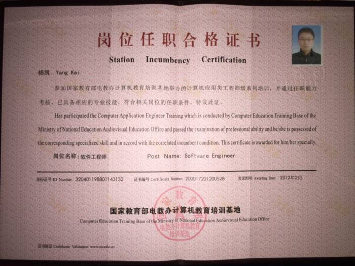 | 2012/06 機動車駕駛證 C1駕駛證 2012/2014 西南科技大學 計算機大專畢業證書 2010/2013 北大青鳥 軟件工程師證書 2014/05 叉車培訓 叉車證 |