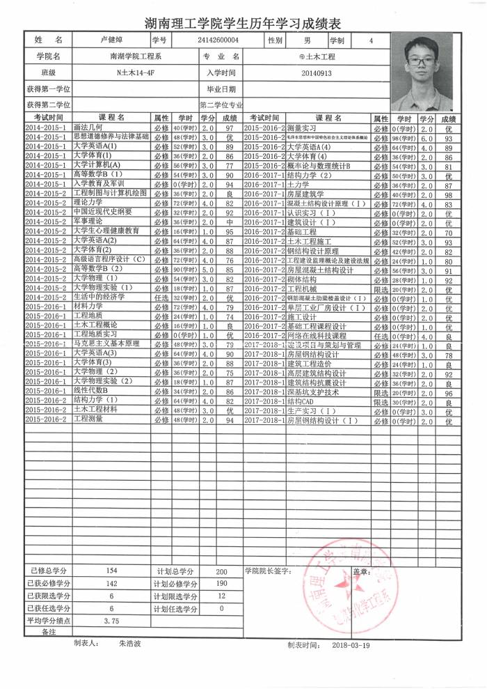 | 2014.9-2018.6 湖南理工學院南湖學院 土木工程畢業 平均成績績點3.73(GPA:A)年級前三 連續三年獲得國家獎學金 湖南省優秀畢業生 在校期間成績穩定排進年級前十 學生會學習部部長 性格活潑,工作積極,熱愛生活。 |